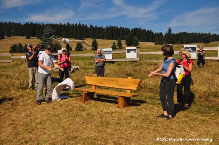 Nach dem vormittäglichen Auftritt der tschechischen Sängerin Karolinna folgte der erste Höhepunkt des Tages. Der Architekt Josef Zumr ging mit den interessierten Gästen an vier Stellen des Ortes und erklärte dort aus seiner Sicht das entbehrungsreiche Leben der früheren Bewohner und anhand historischer Aufnahmen des Fotografen Rupert Fuchs konnten die Teilnehmer, es mögen anfänglich wohl etwa 250 gewesen sein, durch den Vergleich zur heutigen Natur einen Eindruck vom Ort gewinnen. Dabei ging er auf viele Aspekte, wie Verkehrsanbindung und Erwerbstätigkeit ein. Damit alle den Ausführungen und der Übersetzung folgen konnten, wurden drei Funkgeräte genutzt, wobei 2 als Lautsprecher in den entfernteren Bereichen dienten. Die Tschechen sind halt immer noch Meiser der Improvisation. Die dafür vorgesehene Zeit von einer Stunde wurde reichlich überzogen, was aber eher bereichernd wirkte, denn die gestellten Fragen der Teilnehmer erweiterten das Spektrum spürbar. Hungrig kehrten die Teilnehmer des Rundganges zum Festzelt zurück. Trotz der vielen Gäste war die Versorgung mit leckeren Speisen und Getränken ohne lange Warteschlangen bis zum Ende der Veranstaltung gewährleistet. Dies zeugt von einer guten Organisation der unterschiedlichen Anbieter. Auf dem Gelände der einstigen Kirche wurde die „Gedenkbank“ von Sabine Borovanská, Mitarbeiterin der Deutsch-Tschechischen Zukunftsfonds, enthüllt. Es ist Tradition, dass in jedem Ort in dem der „Tag der verschwundenen Gemeinden“ stattfindet, etwas Bleibendes hinterlassen wird. Auf dem Gelände der einstigen Kirche bot der Stand des Veranstalters interessante Literatur und einige Souvenirs an. An einem dortigen Zaun waren historische Fotos mit einer zweisprachigen Erklärung angebracht und Kinder verkauften kleine Schmuckkettchen und andere selbst gebastelte Gegenstände. Auch war Anfänglich die deutschsprachige Broschüre über den Ort Hirschenstand erhältlich. Leider wurde die Nachfrage unterschätzt, sodass die späteren Interessenten dies nicht direkt mit nach Hause nehmen konnten, sondern sich mit dem Postversand begnügen müssen.