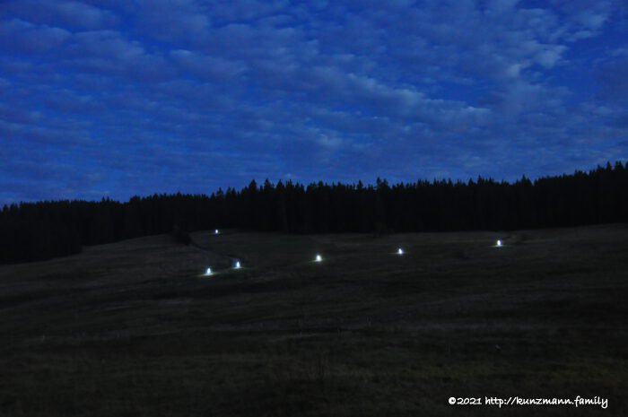 Danach folgte der für viele Besucher emotionale Höhepunkt des Tages. Auf der Südseite des einstigen Dorfes wurden an den Stellen der einstigen Häuser Leuchtstäbe entzündet. So bekam man eine noch bessere Vorstellung vom ursprünglichen Hirschenstand. Wer gleich nach dem Film das Zelt verließ, konnte am nächtlichen Himmel den Überflug der ISS über Hirschenstand beobachten. Welch ein toller Zufall!