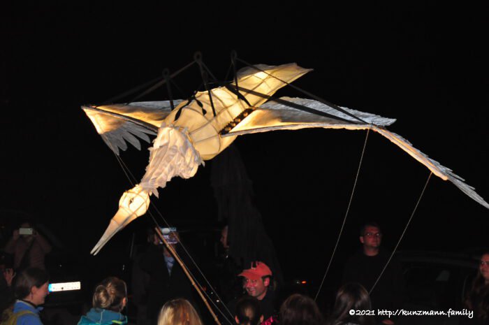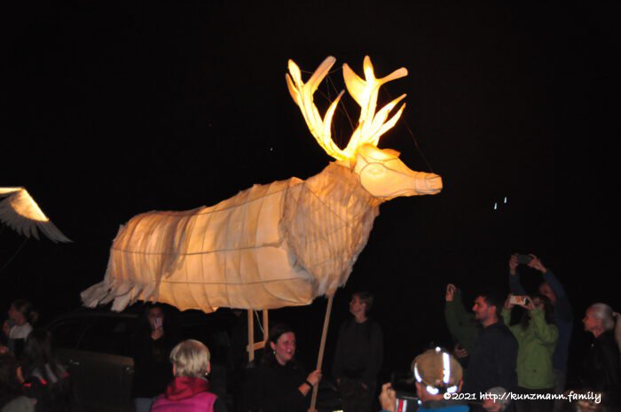 Štěpán Javůrek, der auch Buchautor ist, verlas vor dem beleuchteten Denkmal seine eigenen Gedanken zu Hirschenstand und seinen früheren Bewohnern. Ein großes Lob gebührt dabei der Dolmetscherin aus Ústí nad Labem/Aussig an der Elbe für ihre souveräne Arbeit, wodurch jegliche Sprachbarriere überwunden wurde und alle gleichsam den Ausführungen folgen konnten. Das war aber noch nicht das Ende dieser Veranstaltung. Auf dem Weg aus Richtung Chaloupky/Neuhaus, wo heute kein Haus mehr zu finden ist, wandelten zwei Lichtpunkte. Je näher sie kamen, desto deutlicher wurde es, dass es zwei von innen beleuchtete Hirsche waren. Gleichzeitig tummelte sich eine auf die gleiche Art beleuchtete Biene und ein Storch auf dem Gelände der einstigen Kirche und den angrenzenden Wiesen. Schließlich versammelten sich zum Abschluss alle vier künstlichen Tiere auf dem Kirchplatz, bevor sie dann noch einmal auf dem gesamten Festgelände die Besucher verabschiedeten. Lob und Dank gilt den Organisatoren, Helfern und Unterstützern für diesen wundervollen, unvergesslichen Tag mit einem fast zwölfstündigen Programm in Gottes herrlicher Natur auf den Höhen des westlichen böhmischen Erzgebirges. Bleiben wir gespannt, welcher Ort im kommenden Jahr in den Fokus gerückt wird …